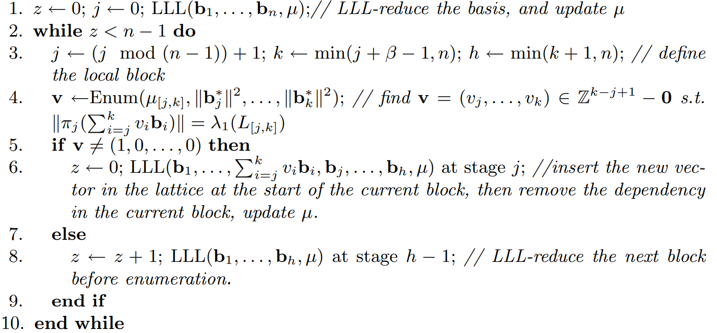 先对输入基进行LLL作为预处理,之后对当前分块进行格枚举求解SVP。若枚举算法得到的最短向量不是当前分块的第一个向量,就将最短向量插入到分块前,重新对整个基进行LLL约化。直到对所有分块都操作完毕。这样得到的输出基通常会优于LLL约化基。分块大致可以视为一种滑动窗口,第一个分块是$(\mathbf{b}_1,\ldots,\mathbf{b}_{\beta})$,第二个分块是$(\mathbf{b}_2,\ldots,\mathbf{b}_{\beta + 1})$…总之每次窗口向右移动一个向量。注意最后的$\,\beta-2\,$个分块长度是小于$\,\beta \,$的。