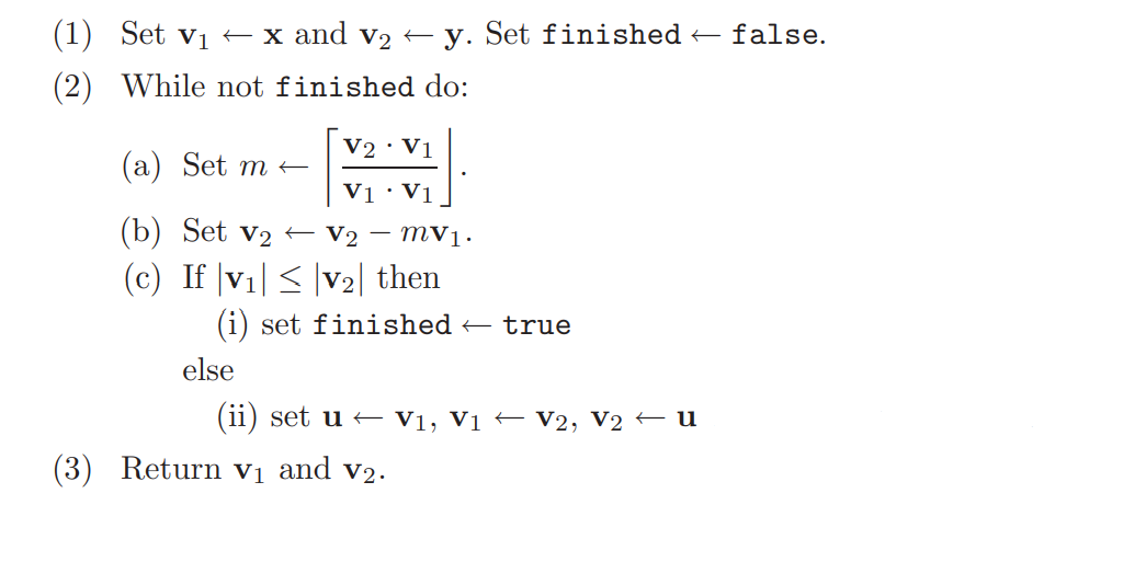 - 输出:格$\,\mathcal{L}\,$的一组最小基$\,\mathbf{v}_1,\mathbf{v}_2$