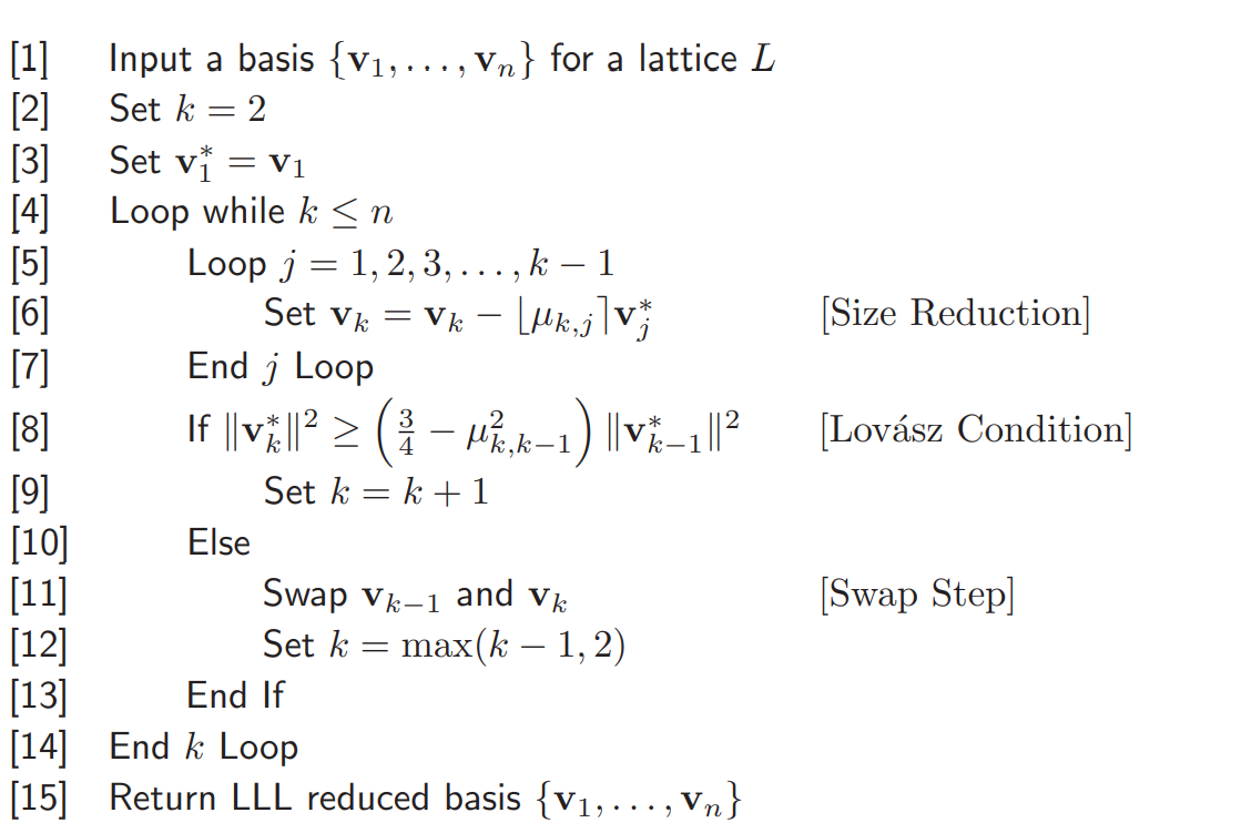 - (size-reduce):对于任意的$\, j<i\le n\,$,有$\, \left|\mu_{i,j}\right| \le \frac{1}{2}\,$,其中$\,\mu_{i,j}=\frac{\left\langle\mathbf{b}_i,\mathbf{b}_j^\ast\right\rangle}{\left\langle\mathbf{b}_j^\ast,\mathbf{b}_j^\ast\right\rangle}\,$为施密特正交化中的系数。